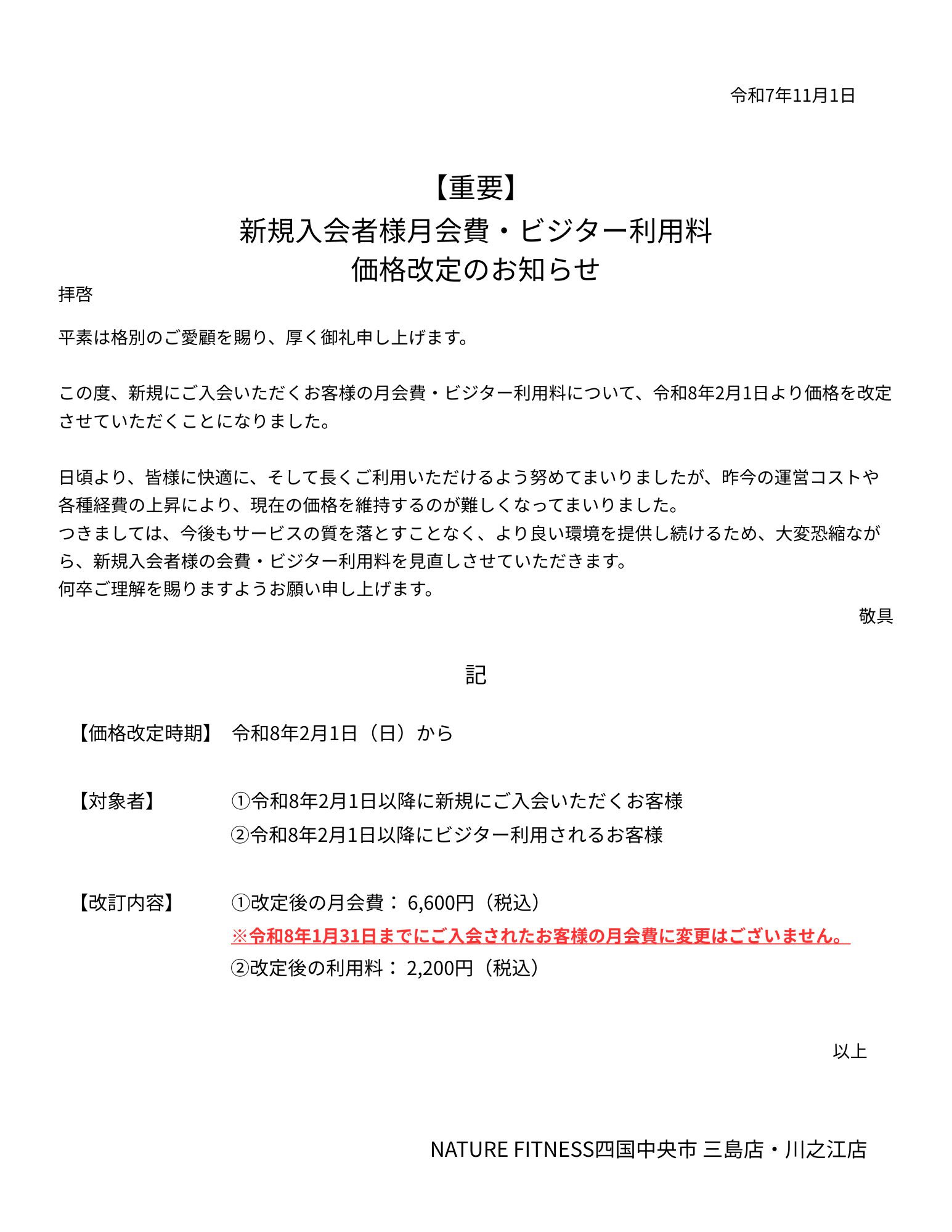 新規入会者様月会費・ビジター利用料 価格改定のお知らせ